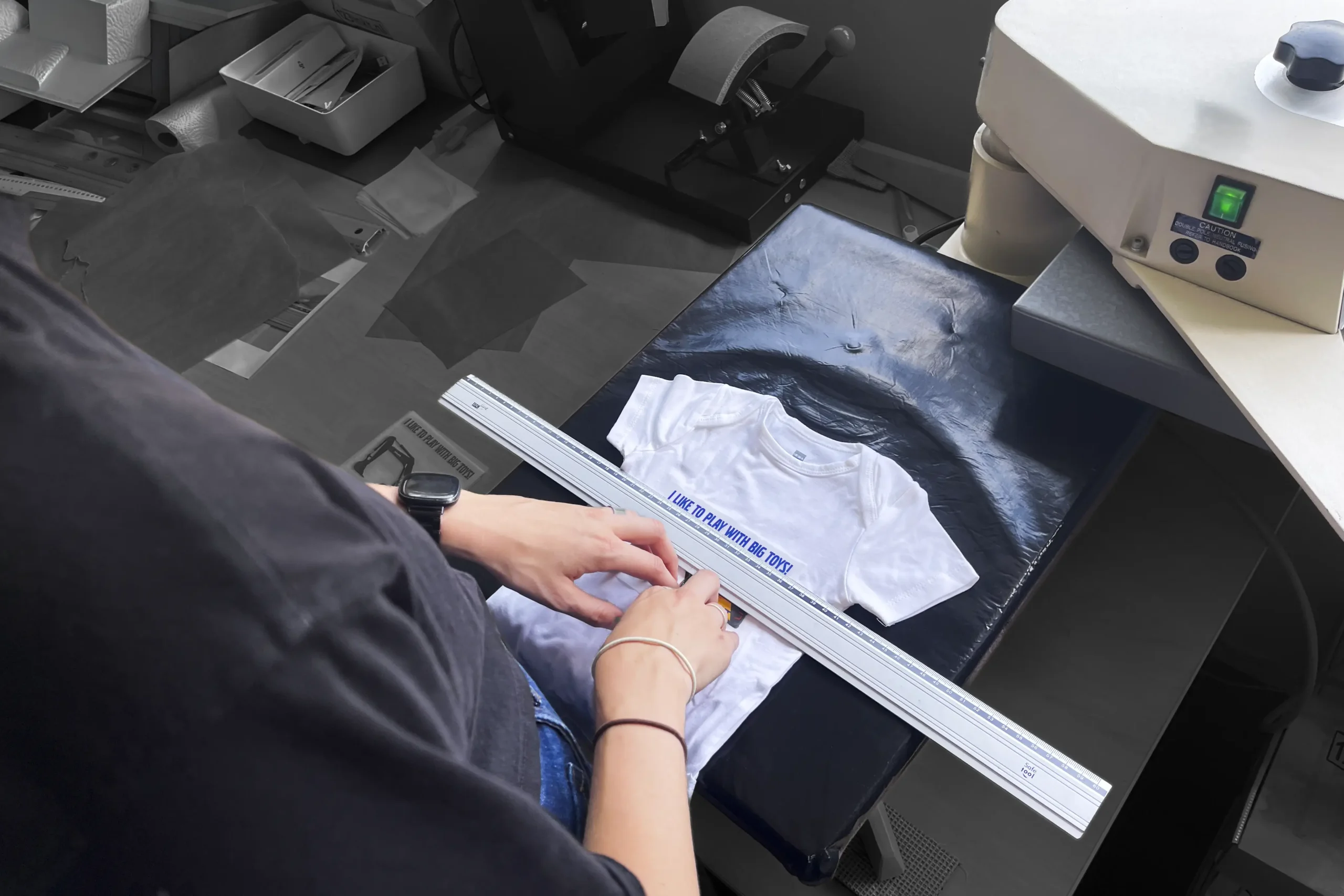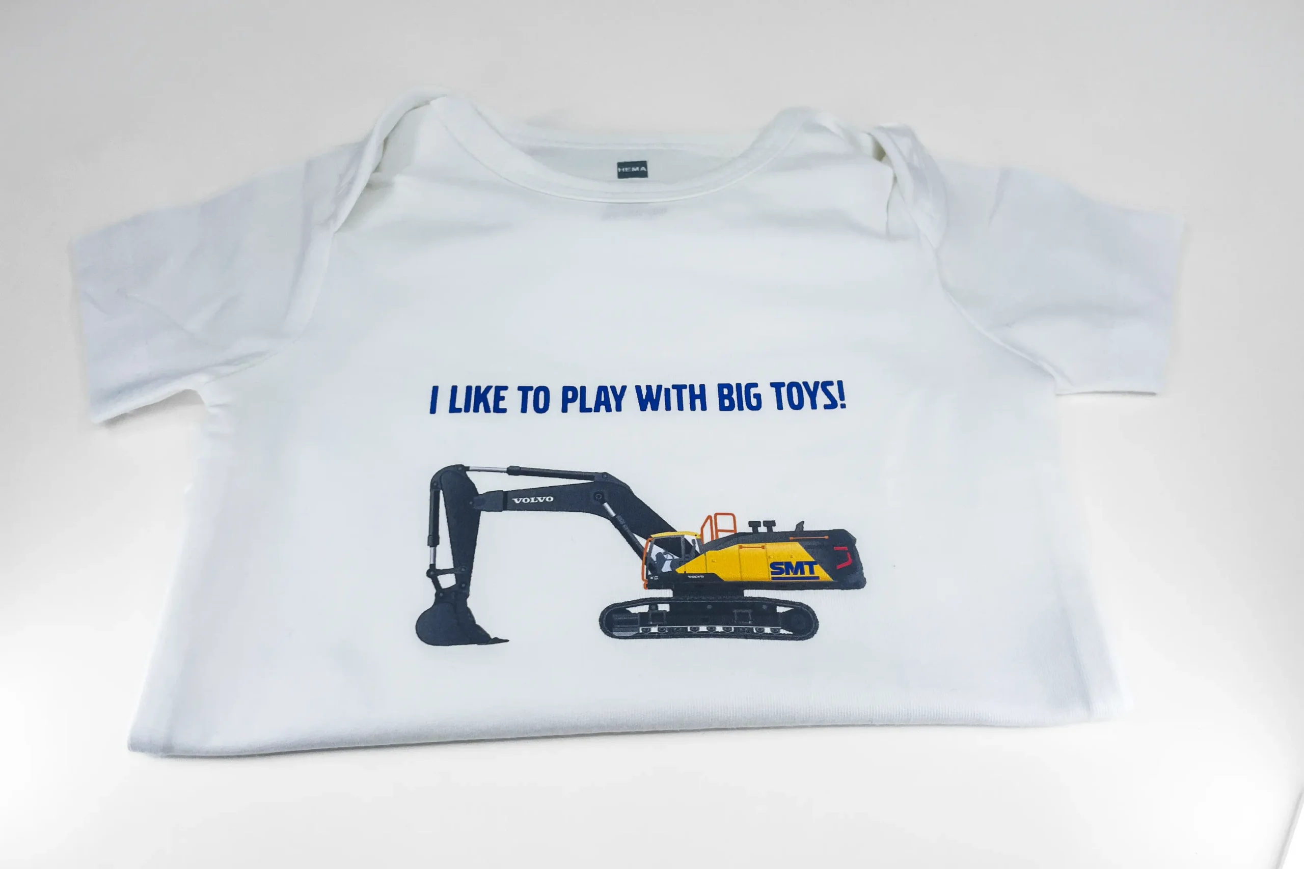 Wat op het eerste gezicht een eenvoudig kledingstuk lijkt, werd een groot statement. De witte babybody vormt een rustig canvas waarop de boodschap meteen duidelijk is. Met de zin “I like to play with big toys!” en een herkenbare graafmachine knipoogt het ontwerp subtiel naar de sector waarin SMT actief is.