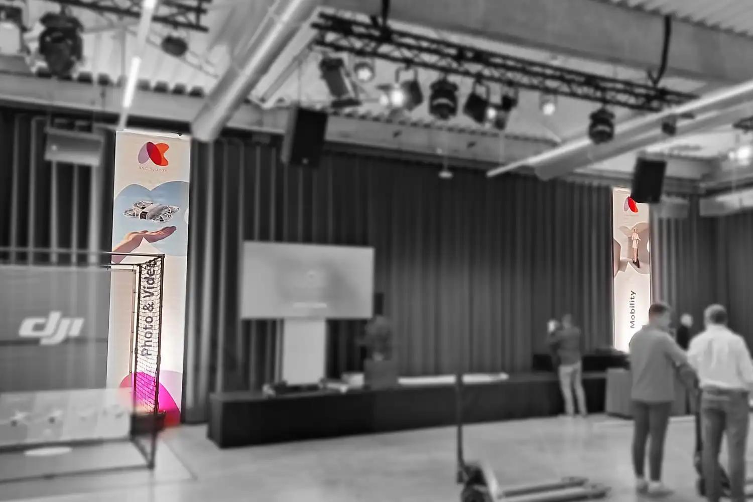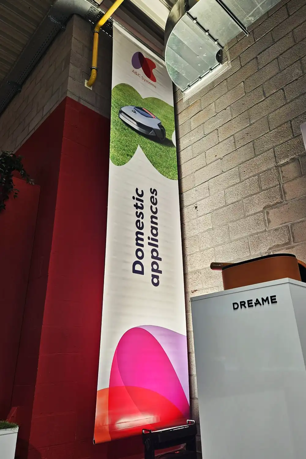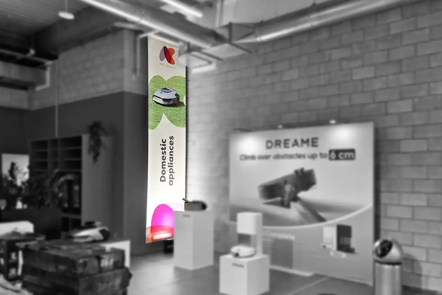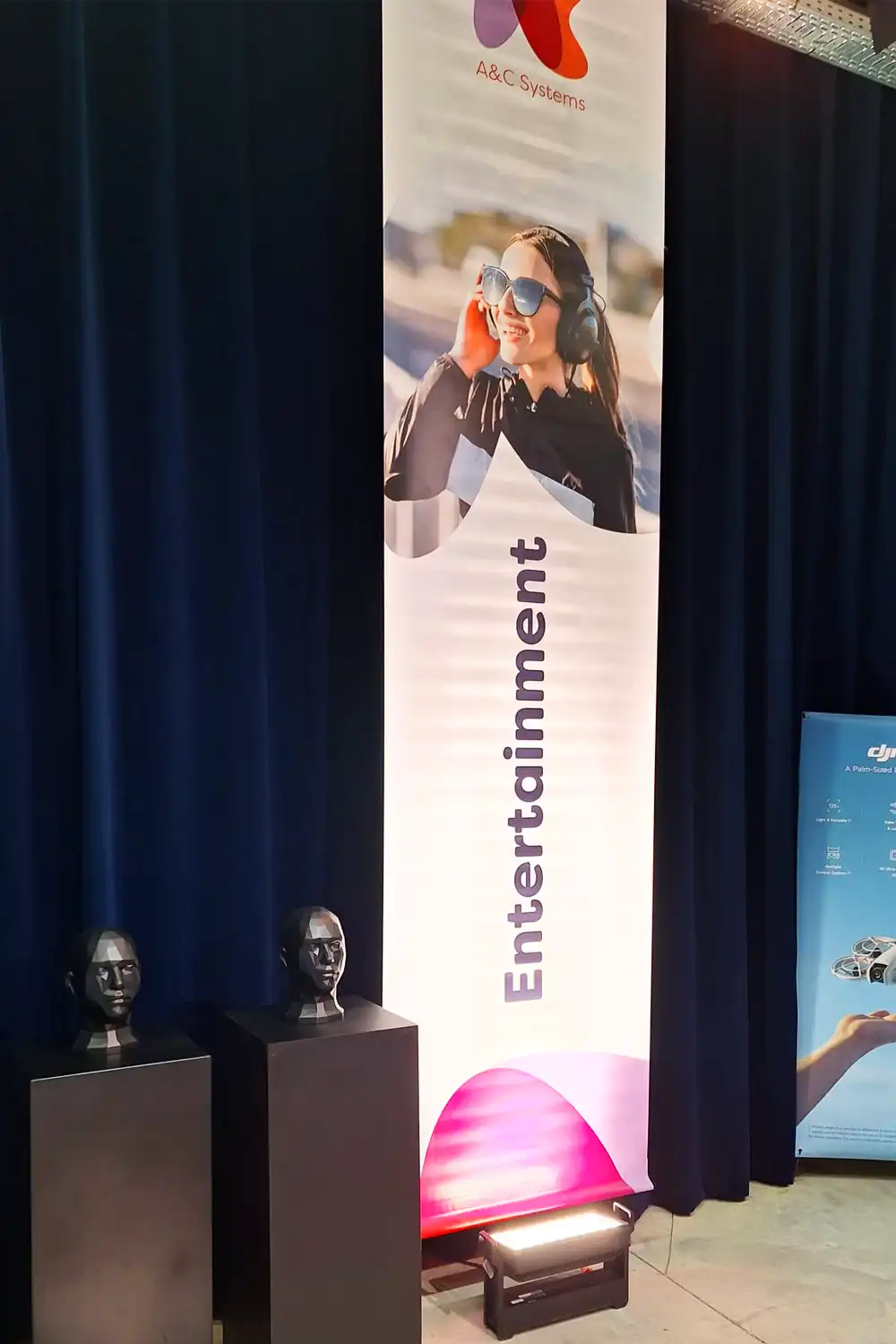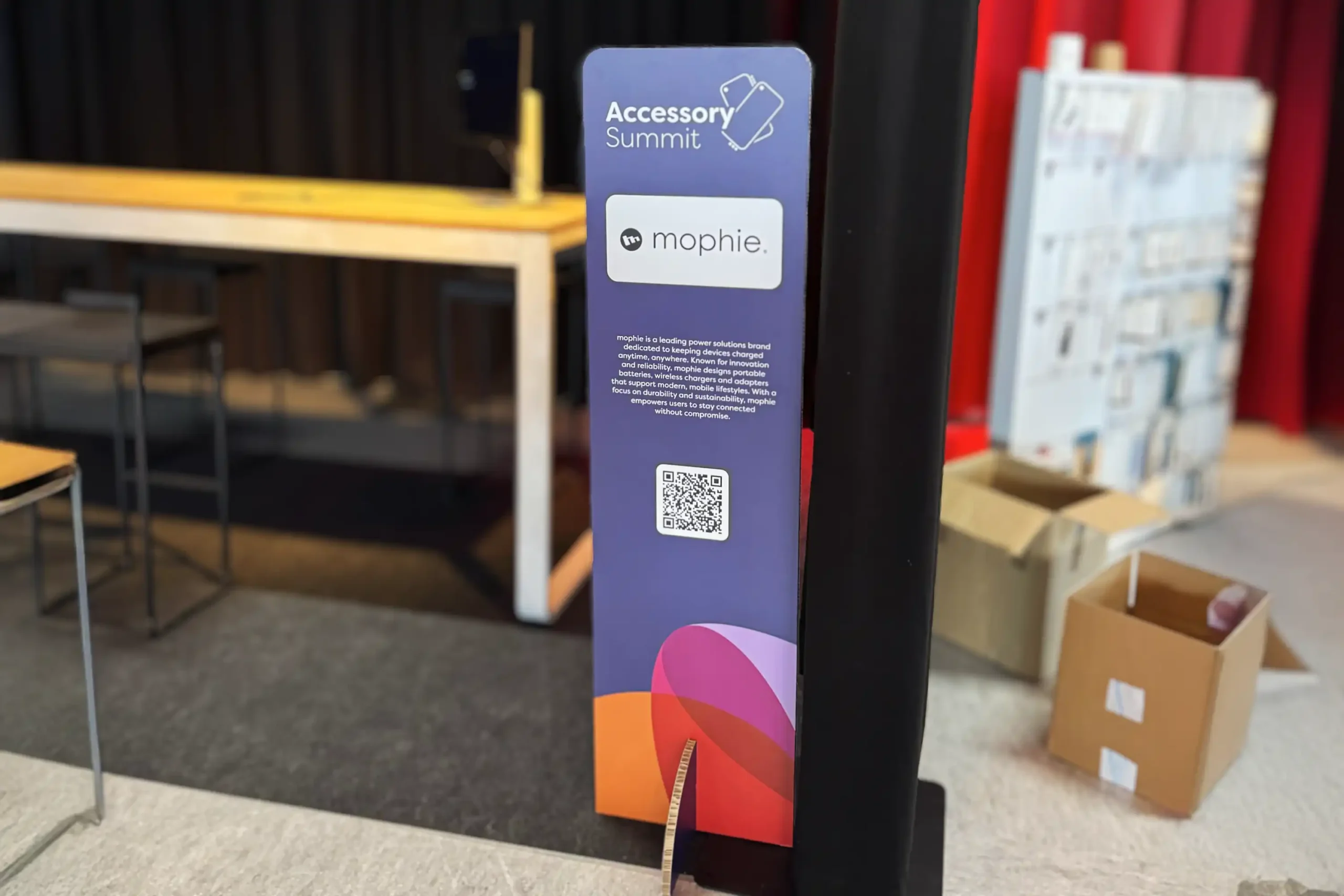 Voor de Accessory Summit van A&C maakten we verticale textielbanners met tunnelmaat die de beursruimte structuur en herkenbaarheid gaven. Elke banner duidde een categorie aan met een duidelijke titel en productvisual, volledig in lijn met de A&C branding. Zo werden Mobility, Photo en video, Domestic appliances, Entertainment en Telecom devices en wearables in één oogopslag zichtbaar en vonden bezoekers vlot hun weg.