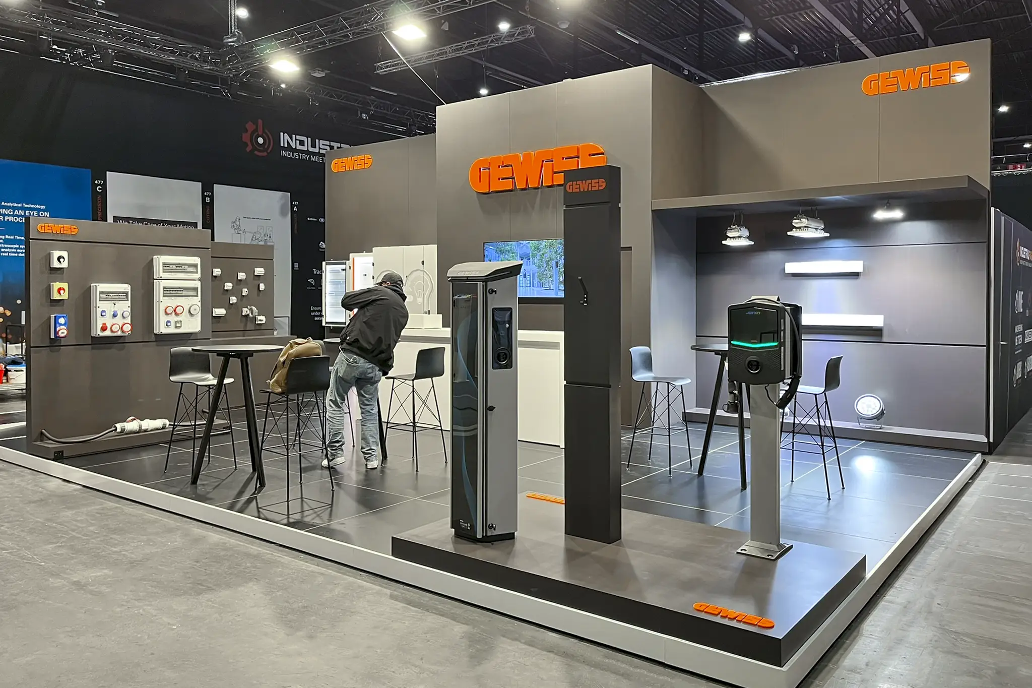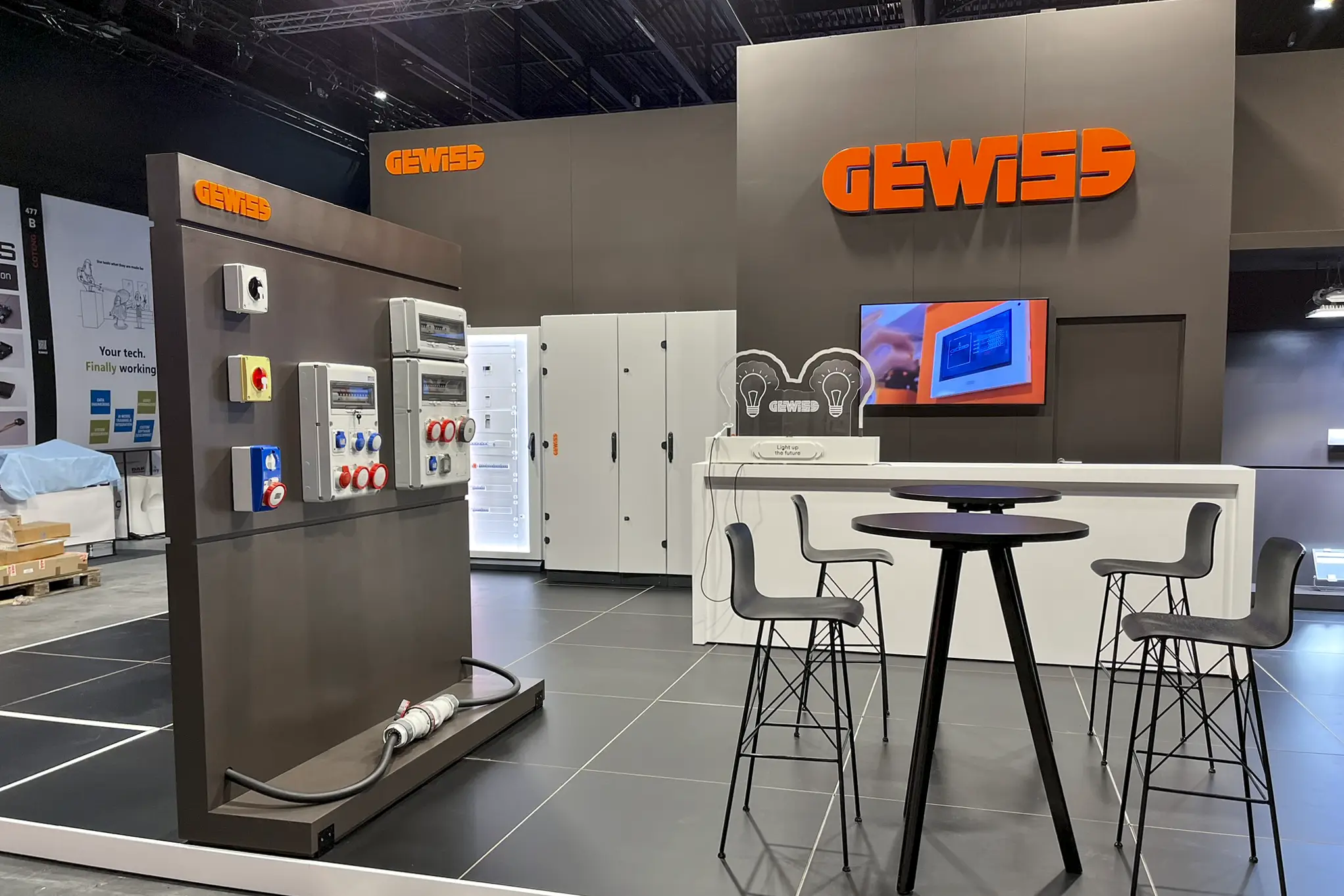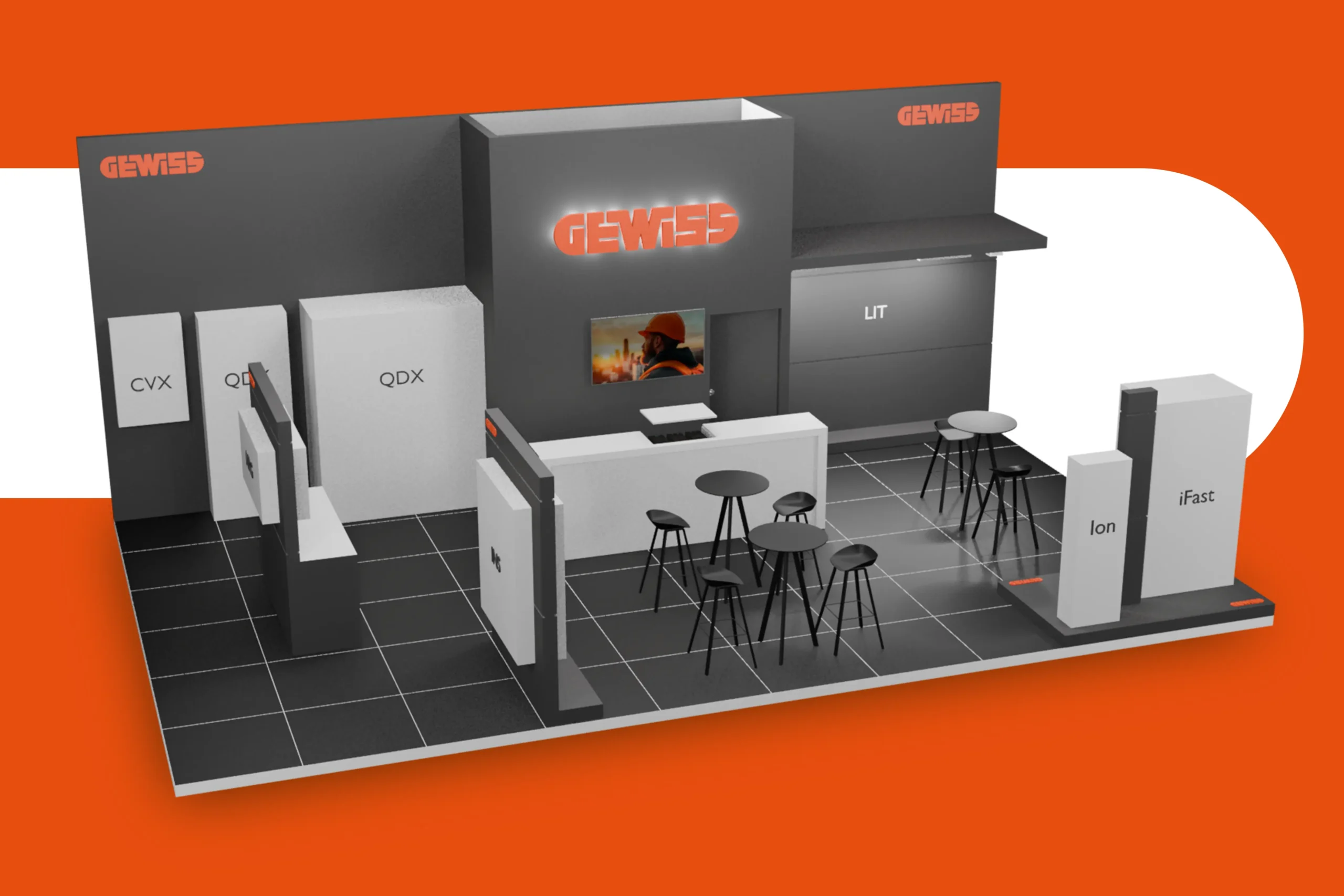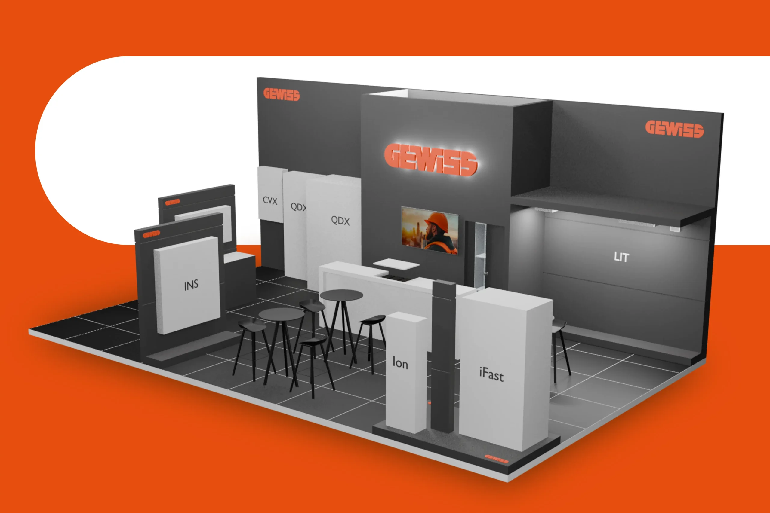 We vertaalden hun merkidentiteit naar een architecturale stand met een duidelijke structuur en krachtige visuele lijnen, waardoor producten en demo’s meteen opvallen en de stand ruim en overzichtelijk aanvoelt. Transparantie en modulariteit vormden de basis, zodat de opstelling flexibel bleef en de oplossingen van Gewiss consequent en helder gepresenteerd werden.