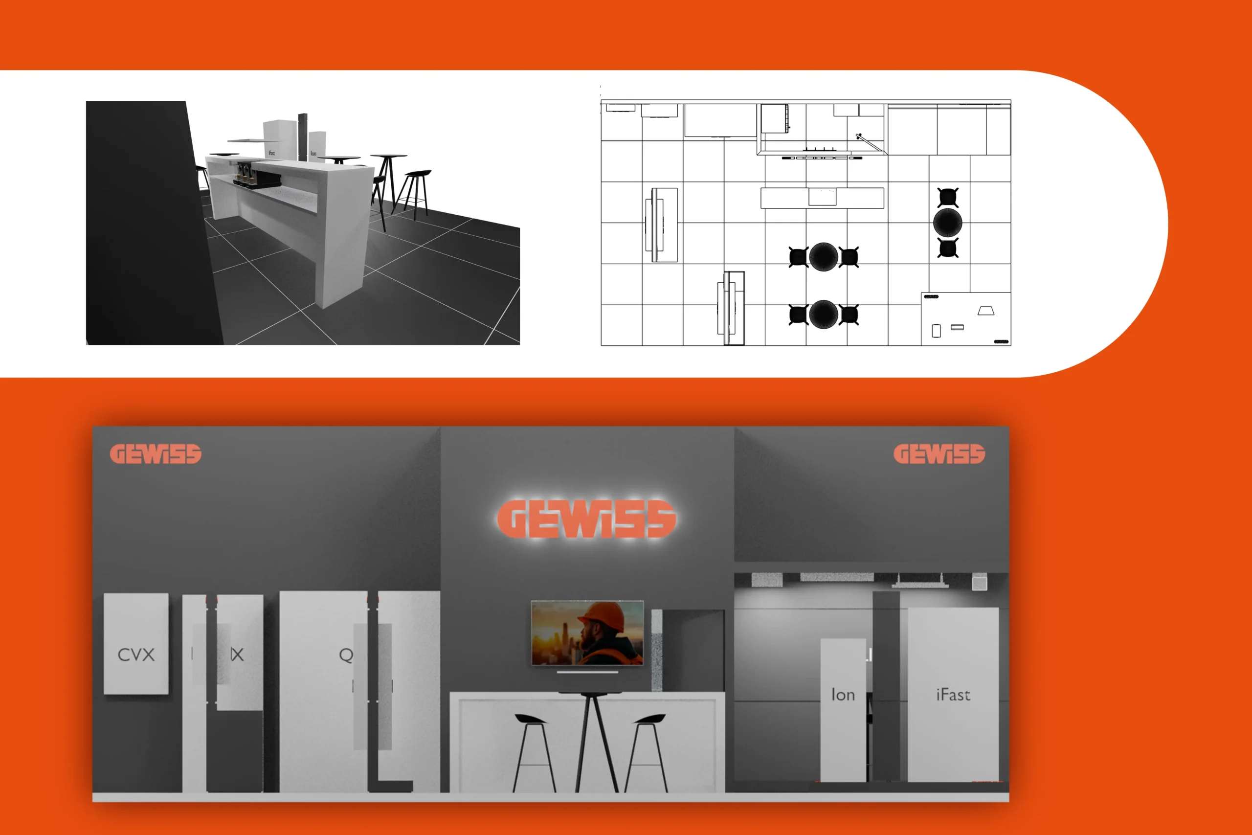 In de ontwerpfase werkten we een 3D ontwerp uit voor een beursstand die naadloos aansluit bij de stijl van Gewiss. De opdracht was een stand van 10 x 6 m (60 m²) te ontwerpen die de modules en technologieën modern en professioneel presenteert, met voldoende ruimte om nieuwe leads comfortabel te ontvangen.