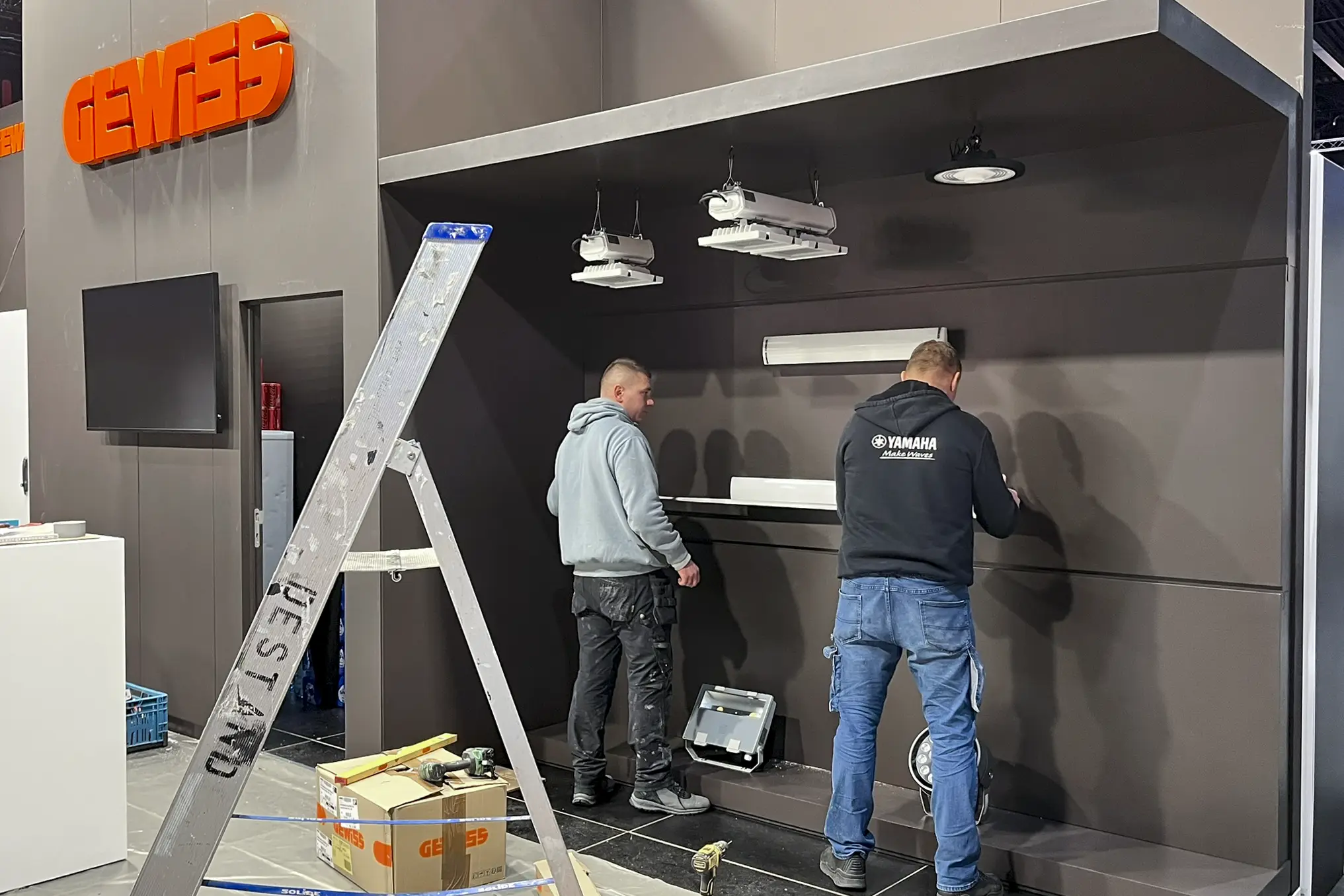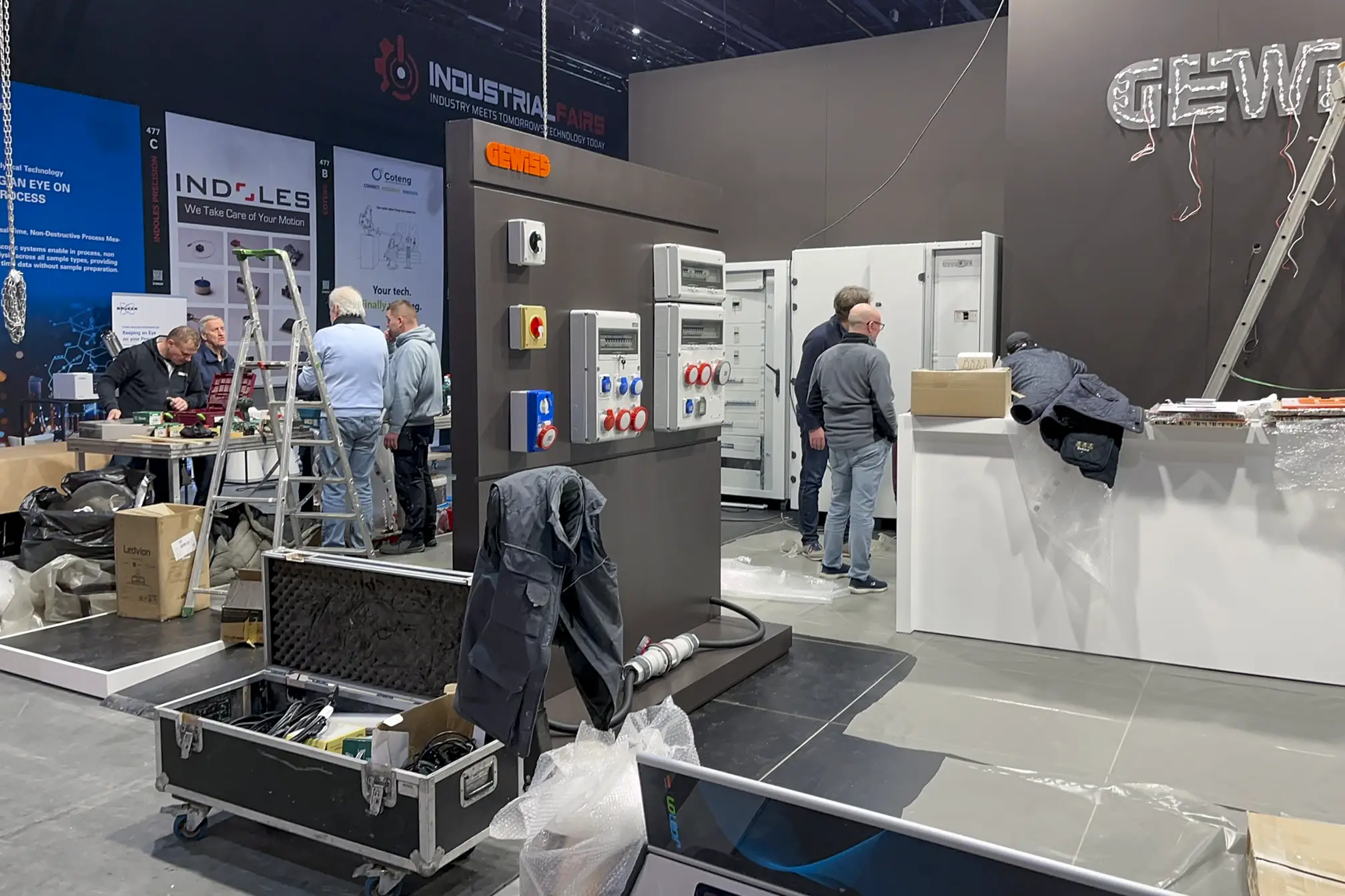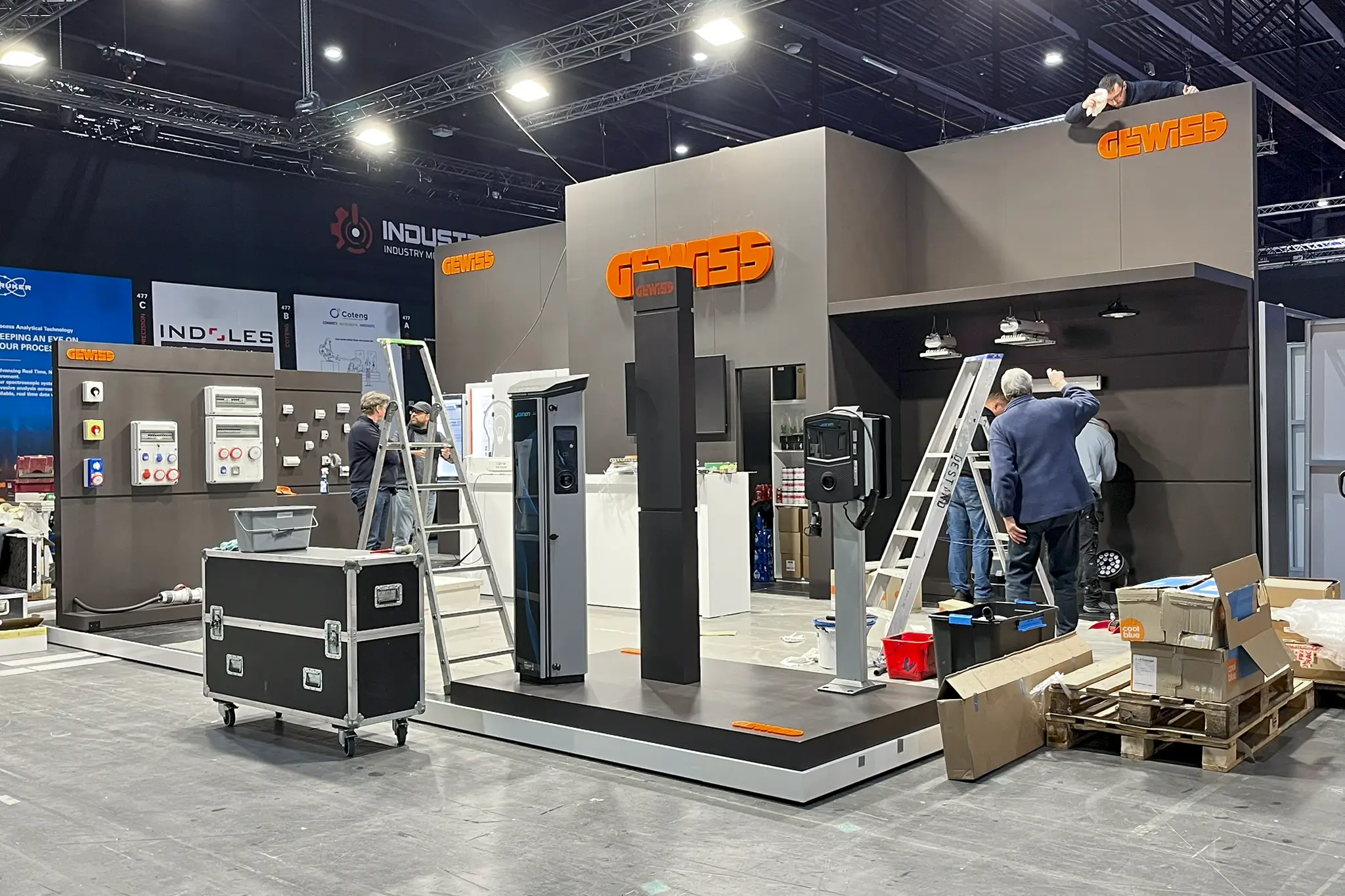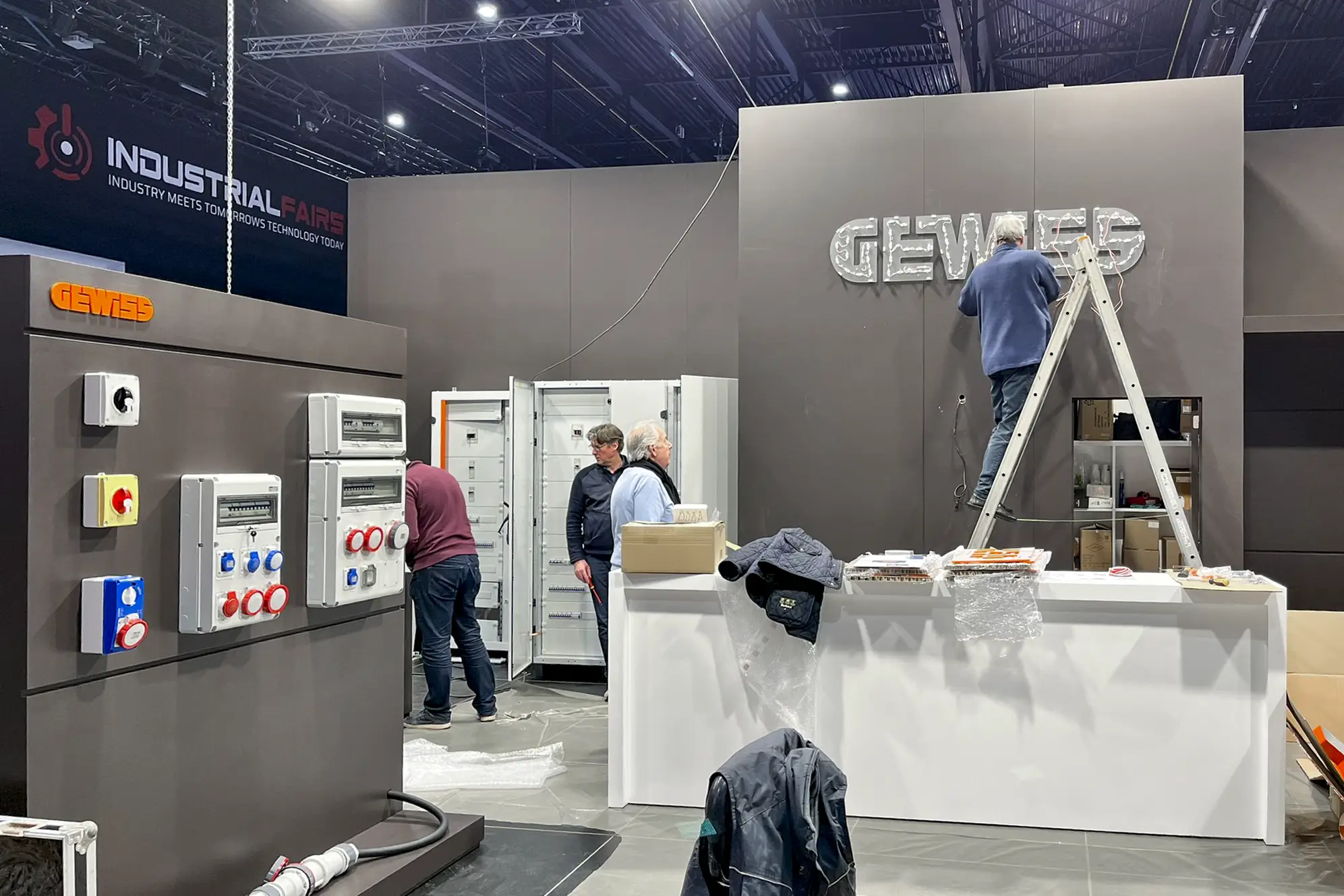 Omdat het geen standaardproducten waren en de modules specifieke technische installatiekennis vereisten, is Gewiss in ons atelier langsgekomen om alles vooraf op de beursmodules te installeren. Zo hoefde er op de expo zelf geen extra tijd naar montage en afregeling te gaan. Na de installatie werden de modules zorgvuldig afgewerkt en klaar gemaakt voor transport en opbouw.