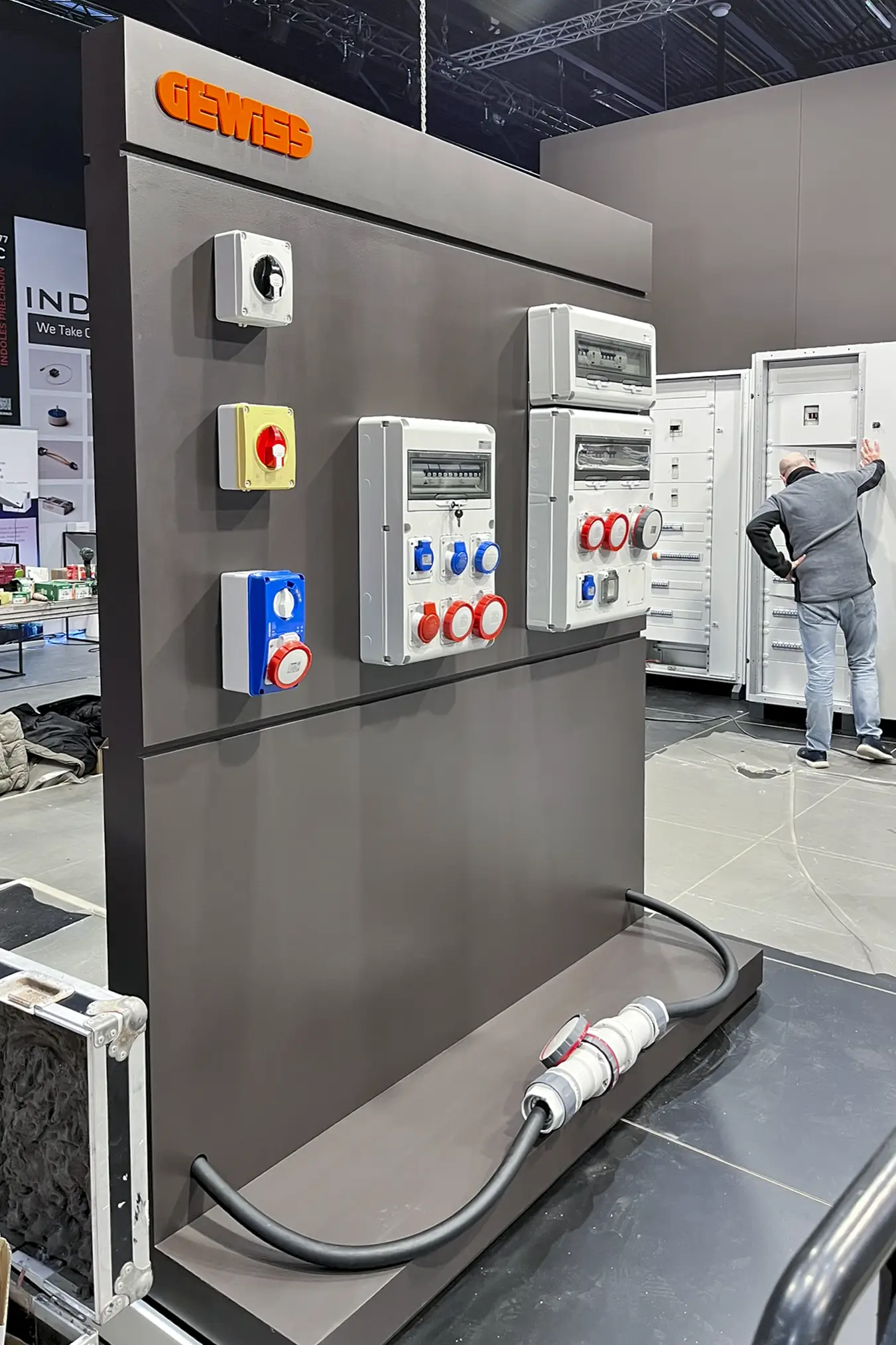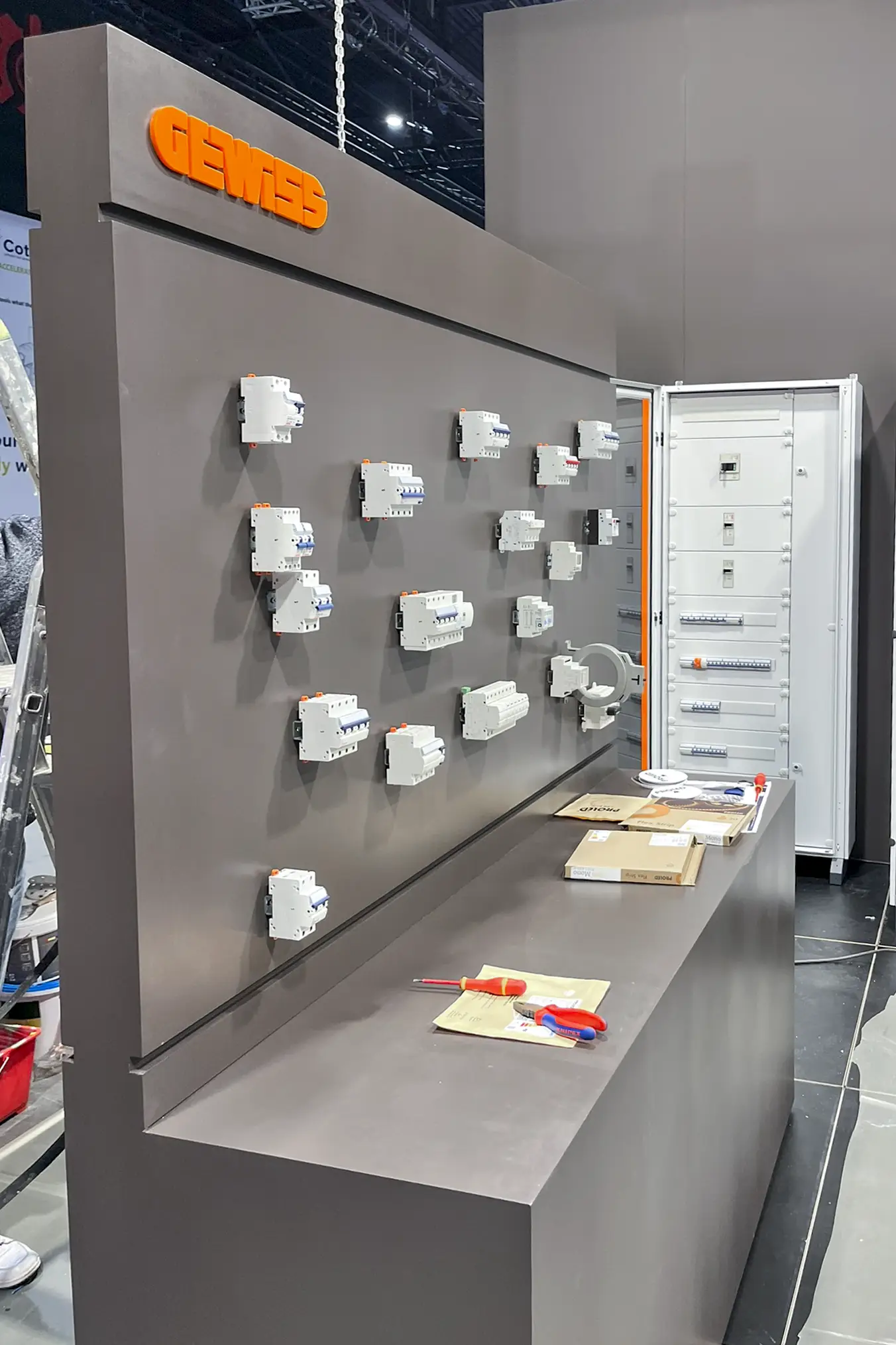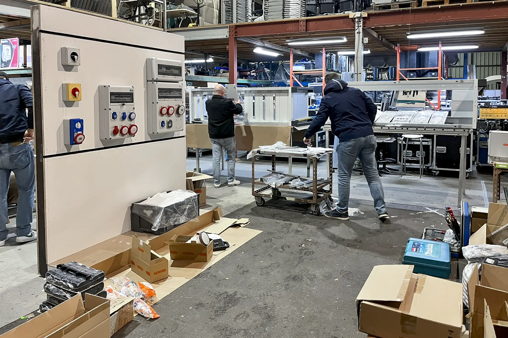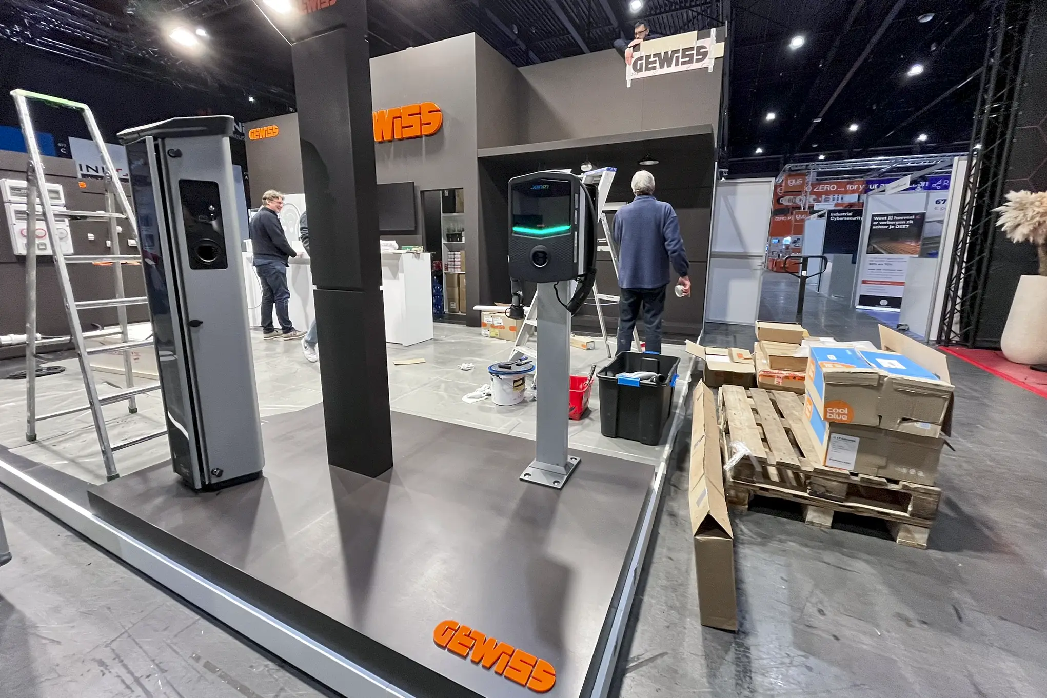 Omdat het geen standaardproducten waren en de modules specifieke technische installatiekennis vereisten, is Gewiss in ons atelier langsgekomen om alles vooraf op de beursmodules te installeren. Zo hoefde er op de expo zelf geen extra tijd naar montage en afregeling te gaan. Na de installatie werden de modules zorgvuldig afgewerkt en klaar gemaakt voor transport en opbouw.