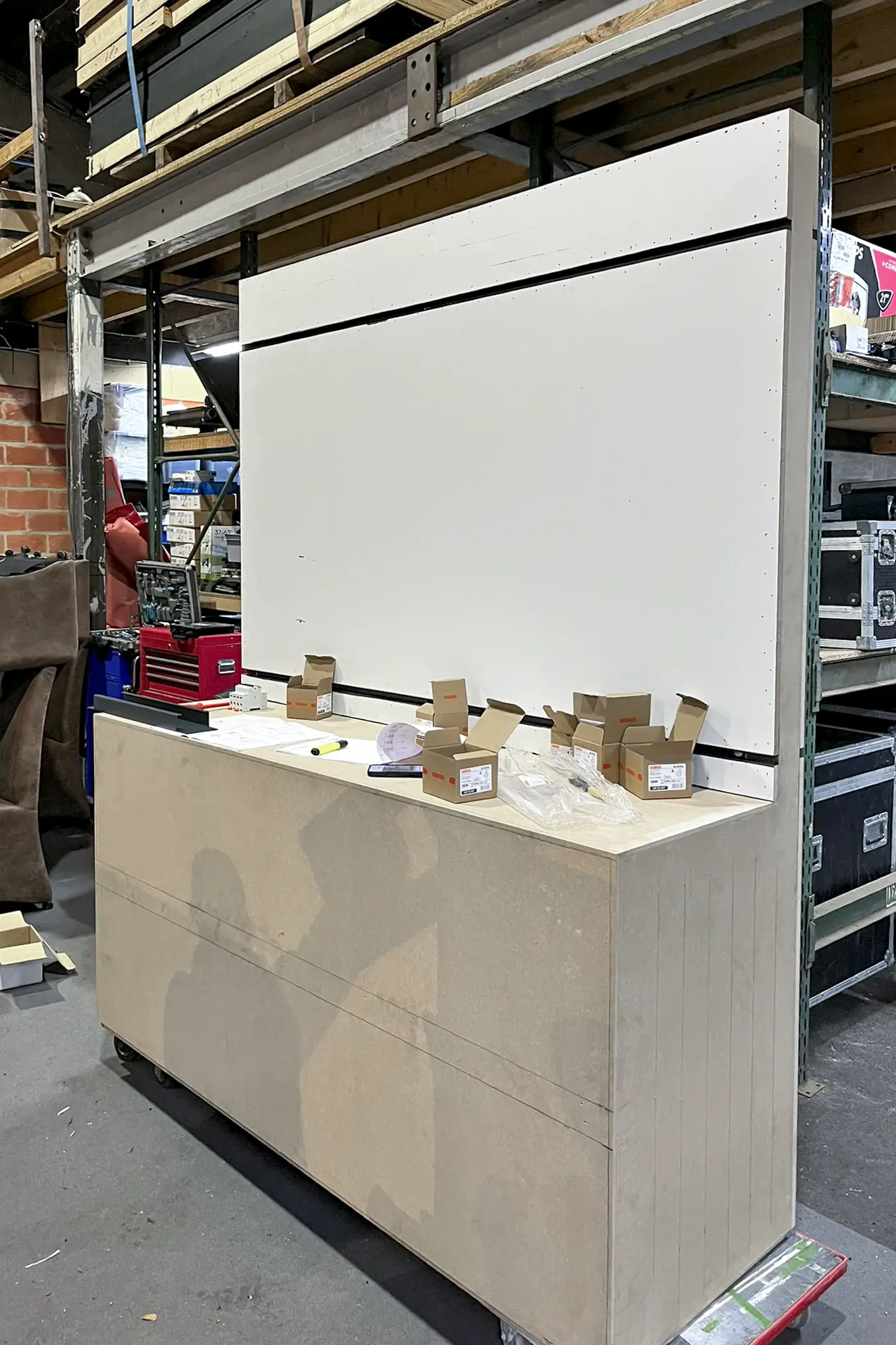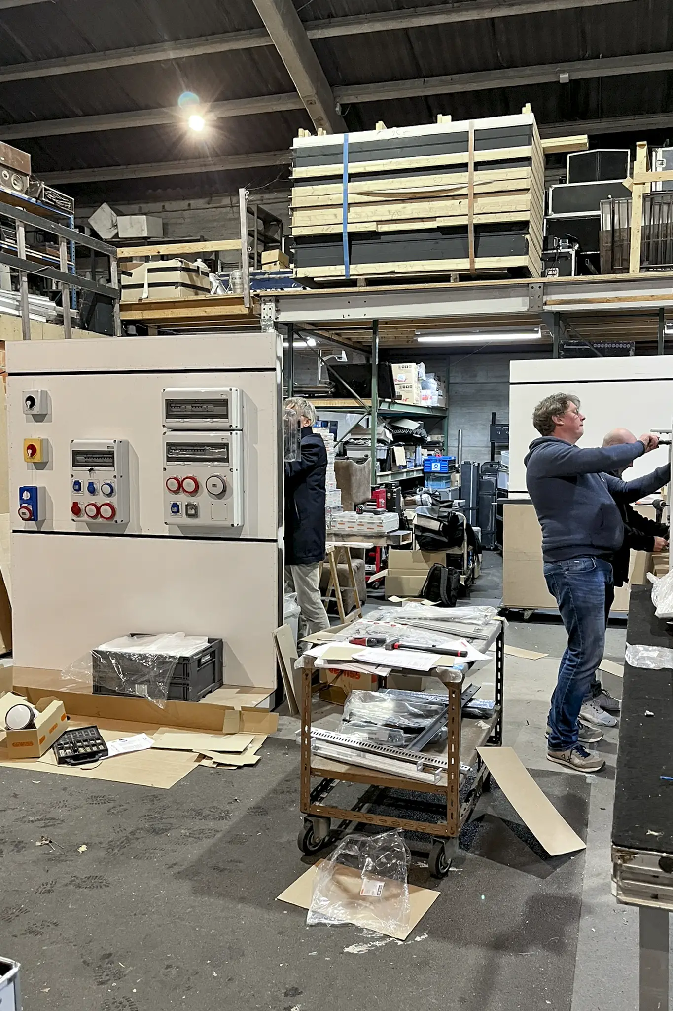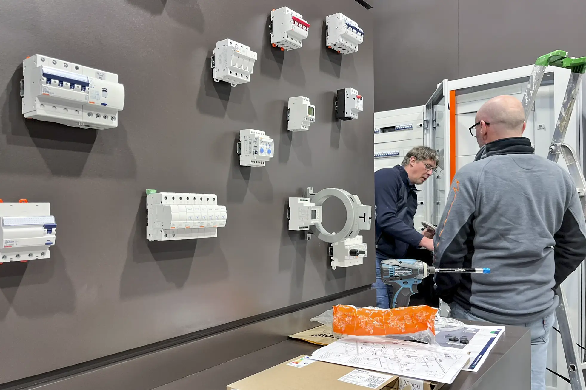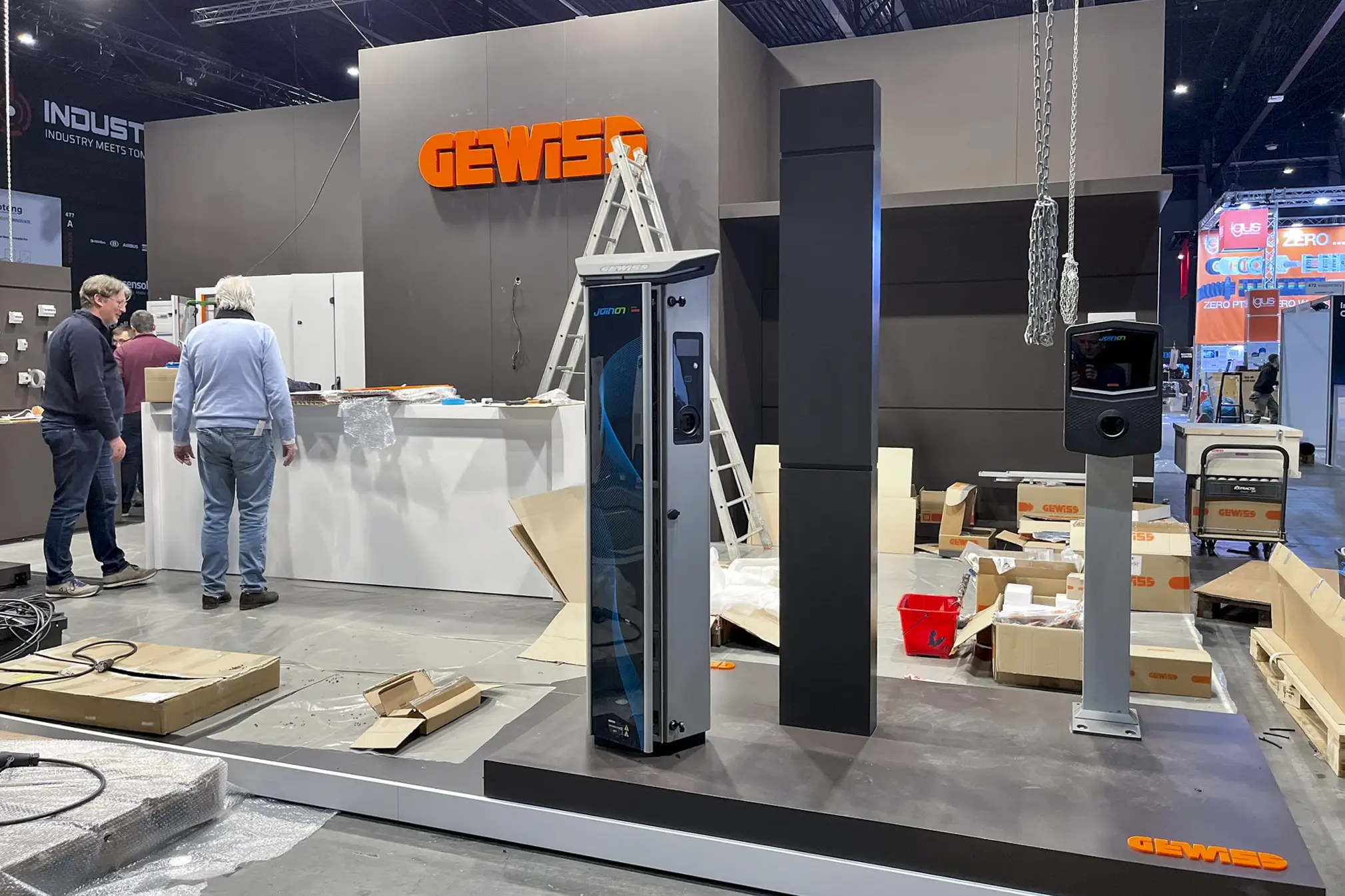 Omdat het geen standaardproducten waren en de modules specifieke technische installatiekennis vereisten, is Gewiss in ons atelier langsgekomen om alles vooraf op de beursmodules te installeren. Zo hoefde er op de expo zelf geen extra tijd naar montage en afregeling te gaan. Na de installatie werden de modules zorgvuldig afgewerkt en klaar gemaakt voor transport en opbouw.