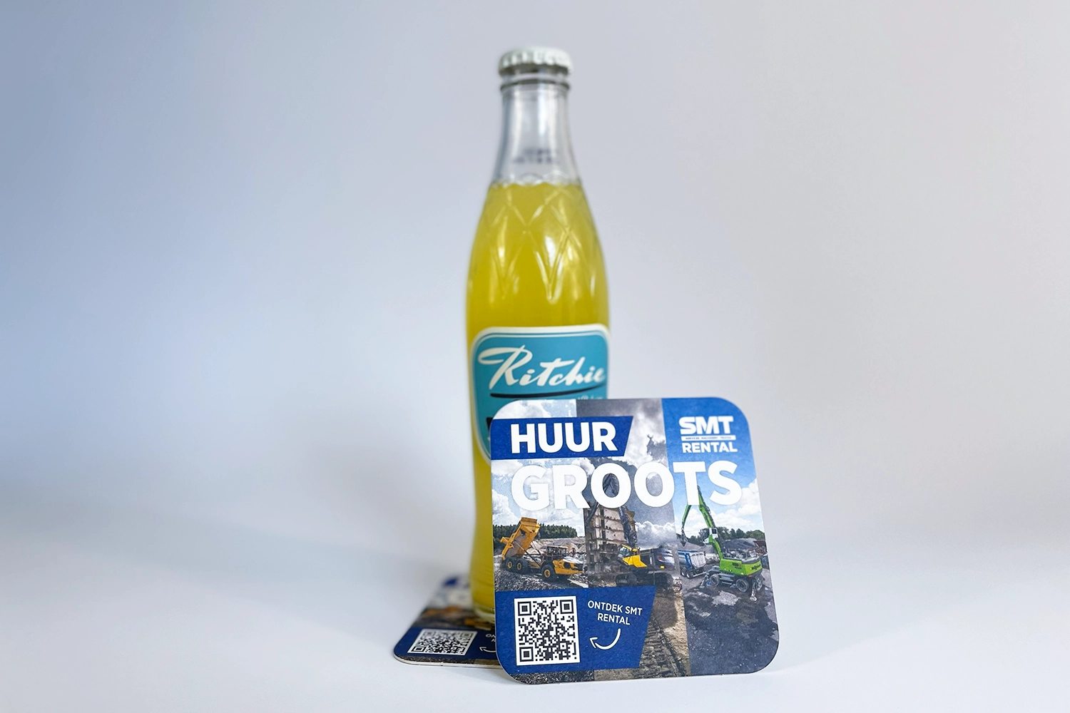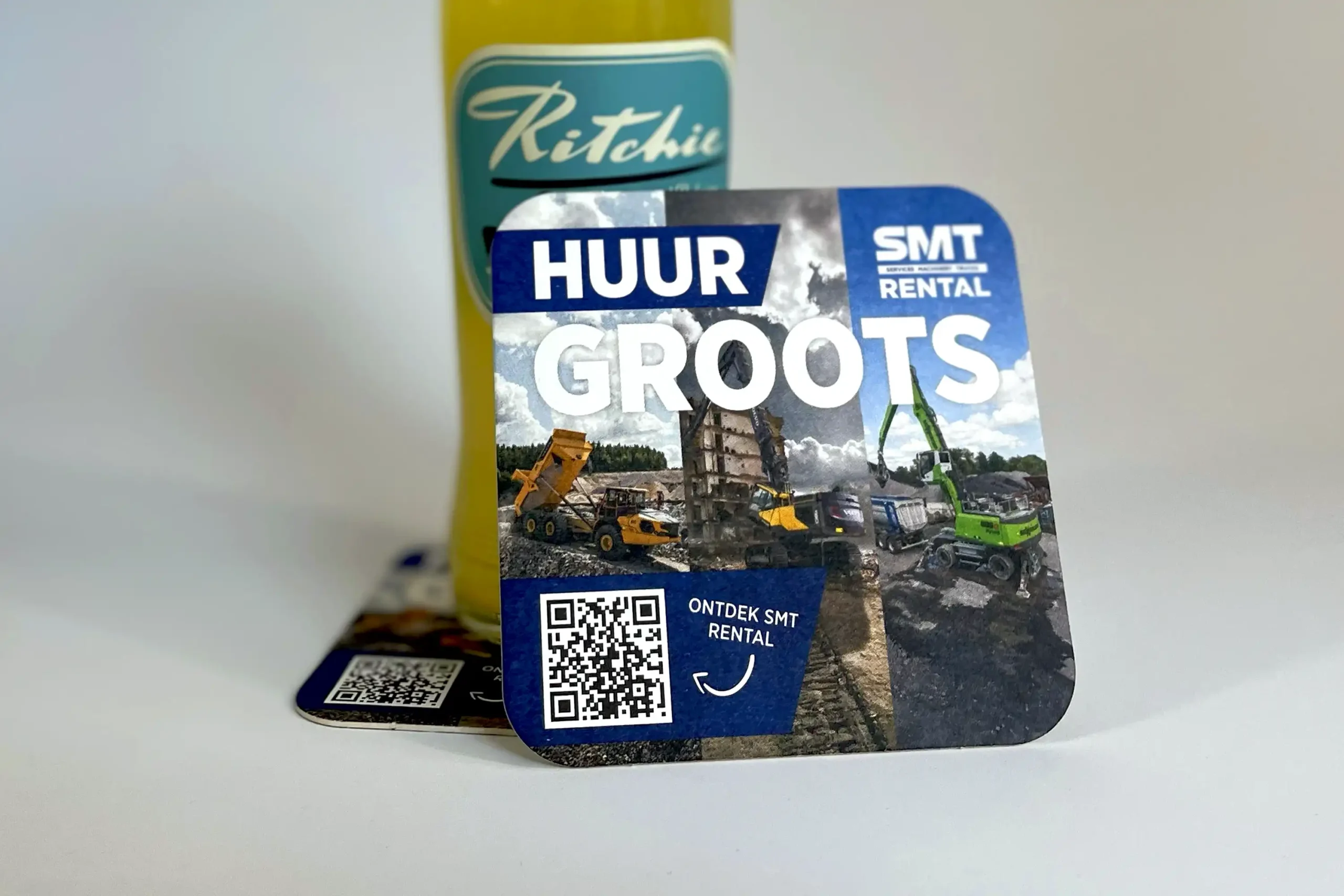 Van de werf naar de kantine: branding werkt overal. Voor SMT Rental ontwierpen we gepersonaliseerde bierviltjes. Een slimme, laagdrempelige manier om op een informeel moment top-of-mind te blijven.