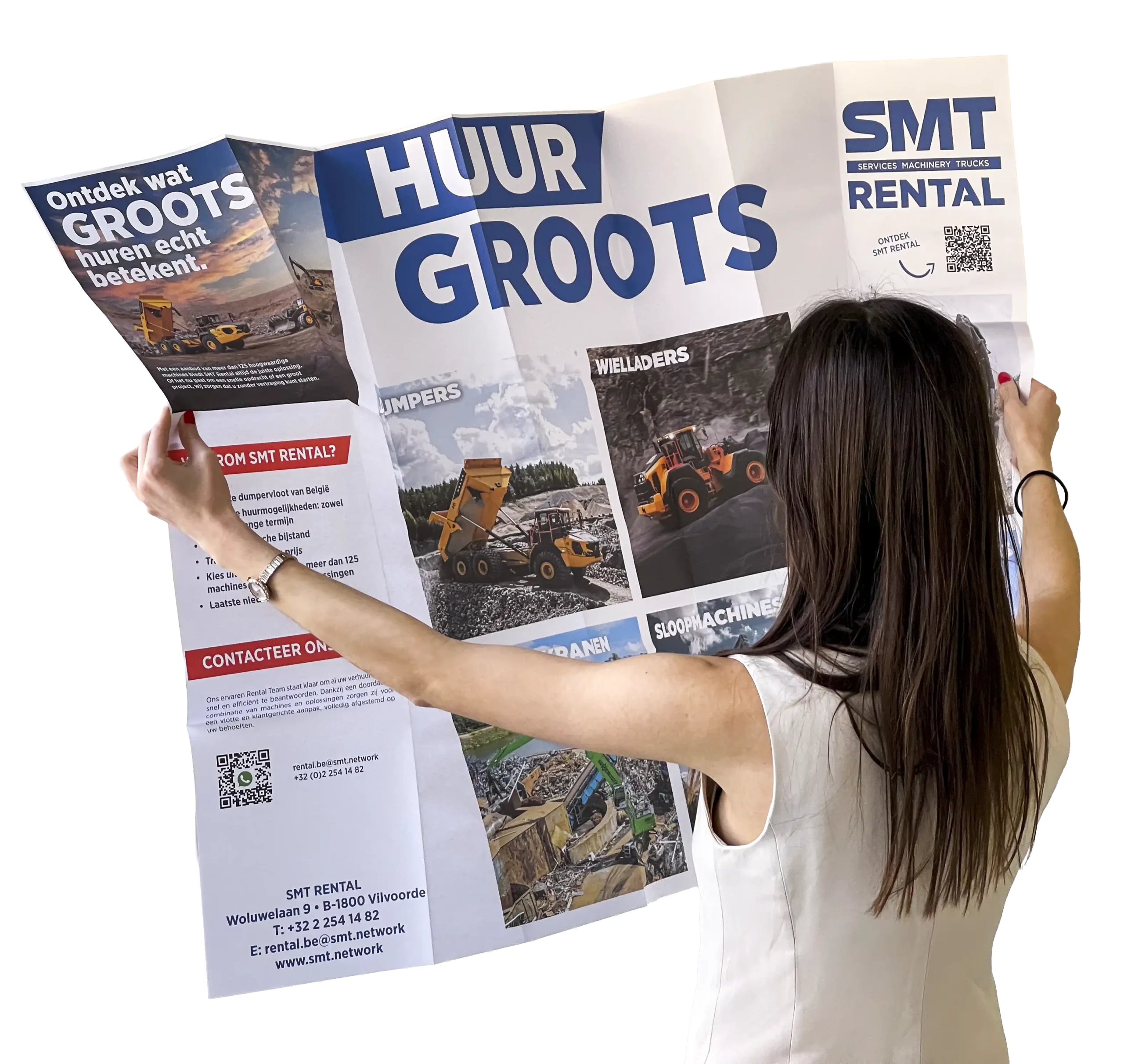 Soms moet je groots uitpakken om op te vallen. Voor SMT Rental ontwikkelden we een opvallende A0 Direct Mailing onder het motto: “Huur GROOTS”. Deze reusachtige mailing trekt direct de aandacht bij binnenkomst en communiceert in één oogopslag de kracht van het verhuuraanbod, inclusief alle machine-opties en directe contactinformatie. Een fysiek statement dat je niet zomaar aan de kant schuift.