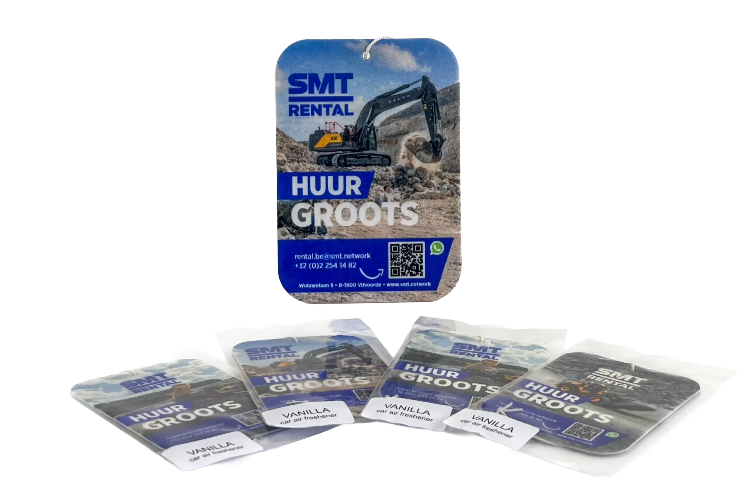 Branding die je kunt ruiken. We gaven letterlijk een frisse toets aan de cabines van hun machinevloot. We ontwierpen gepersonaliseerde geurhangers met unieke illustraties voor elk type machine: van robuuste kranen en krachtige dumpers tot wendbare wieldumpers. Een slimme gadget die niet alleen zorgt voor een aangename werkomgeving, maar de merkidentiteit van SMT tot in de kleinste details van de machine doortrekt.